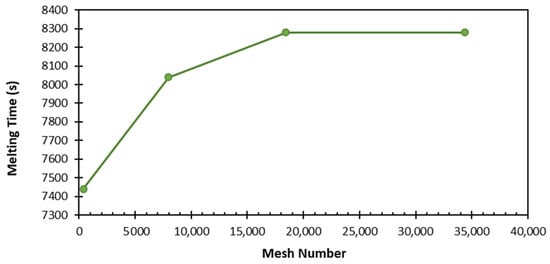 In the three-dimensional time-dependent study, four different element numbers—392; 7975; 18,432; and 34,398—and three different time steps—0.5, 0.1, and 0.2—were used. As a result of these studies, the total melting time of the PCM did not change significantly with an increasing mesh number, and no change was observed after 18,432 elements (Figure 6). Considering the optimal value and time, the time step of 0.1 s and 18,432 elements were adequate for the study. The numerical analysis found that the minimum–average–maximum element quality and orthogonal quality values were above 0.99, and the skewness value was below 0.1. This supports the conclusion that the model had a high-quality mesh structure. Figure 7 shows the mesh structure of the TESU.