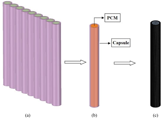 Drawings of PCM capsules: (a) PCM with nine capsules; (b) numerical model of the encapsulated PCM; and (c) mesh structure of the encapsulated PCM.