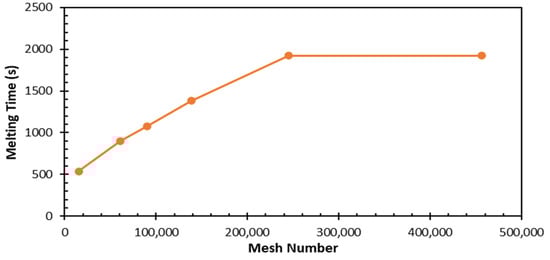 In the three-dimensional time-dependent study investigating the encapsulated PCM, mesh independence was performed, and six different element numbers—15,556; 61,086; 90,276; 138,369; 244,836; and 456,298—were studied. As a result of the studies, it was observed that the total melting time of the PCM increased with an increase in the mesh number, and no changes were observed after 244,836 elements (Figure 9). Considering the optimal value and time, 244,836 elements was adequate for this study.