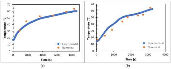 As a result of the comparison, it was observed that the experimental results and numerical modeling were compatible with each other. As seen in Figure 10a, the total melting time of P1 was 8280 s in the numerical analysis results, while this value was found to be 8580 s in the experimental results. Similar results were found when the numerical and experimental results of encapsulated paraffin were compared. As seen in Figure 10b, the total melting time of EP1 was 3120 s in the numerical analysis results, while this value was 3240 s in the experimental results. In addition to the total melting time, the time dependence of the temperature at T3 for both P1 and EP1 was analyzed for both cases.