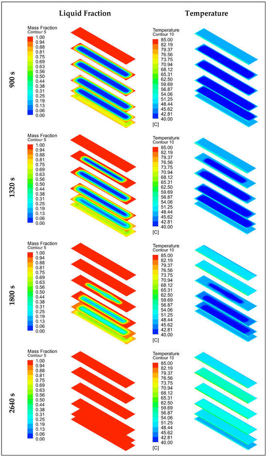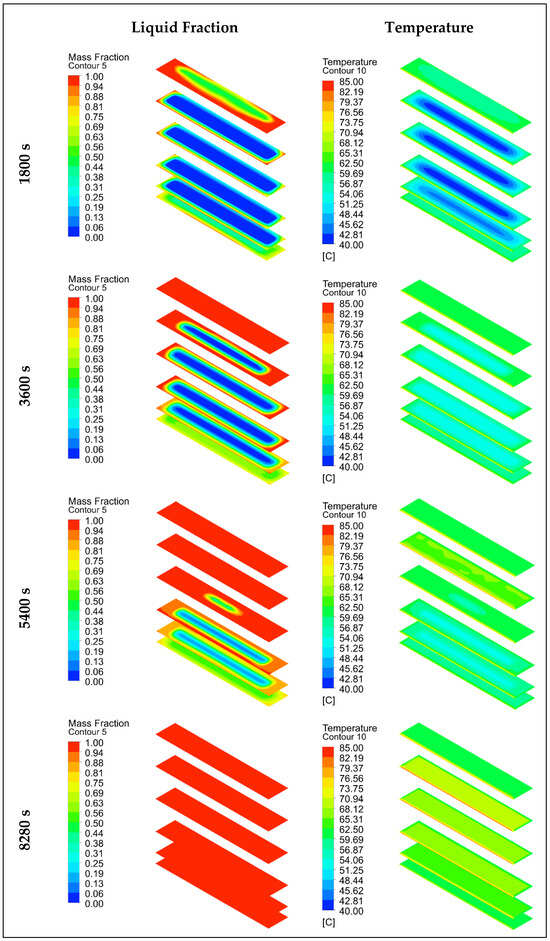 Liquid fraction and temperature contours of EP1 during the melting (charging) process.