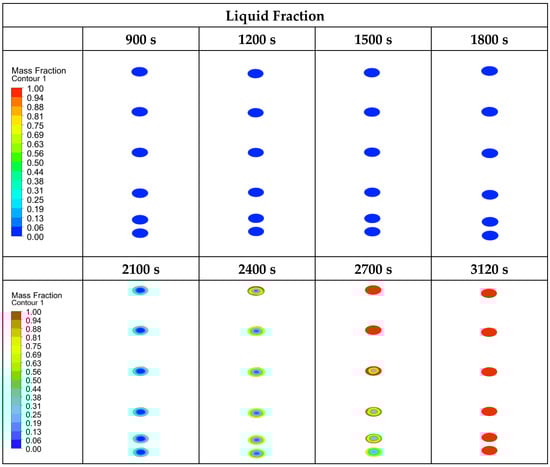 In the numerical model for P2 and EP2, the complete melting and solidification temperatures were taken as 46.1 °C and 31.7 °C. Figure 13 and Figure 14 show the time-dependent temperature and liquid fraction contours for the melting process of the 3D model given in Figure 8b. Six planes were assigned on the XZ-axis in the numerical model of the encapsulated paraffins. Figure 13 shows the liquid fraction and temperature contours of both the paraffin and the capsule (outer side of capsule, inner side of paraffin) during the melting process of encapsulated paraffin-1. As can be seen, the liquid fraction of EP1 was 0 in the first 1800 s. This was due to the wall thickness of the aluminum capsule. The heat flux defined on the outer surface of the capsule traveled to the inner surface of the capsule by conduction. When the inner surface of the capsule reached a sufficient temperature, melting started. The paraffin melted faster in the places where it contacted the capsule walls. In this way, the melting profile in the XZ-axis was from the capsule surfaces to the middle parts. Due to the effect of natural convection, melting in the vertical direction took place from the upper plane to the lower plane. Compared to Figure 11, unencapsulated paraffin-1 melted in 8280 s, while encapsulated paraffin-1 melted in 3120 s. Therefore, the macrocapsule contributed 62.32% to the heat recovery in this storage system during the charging process.