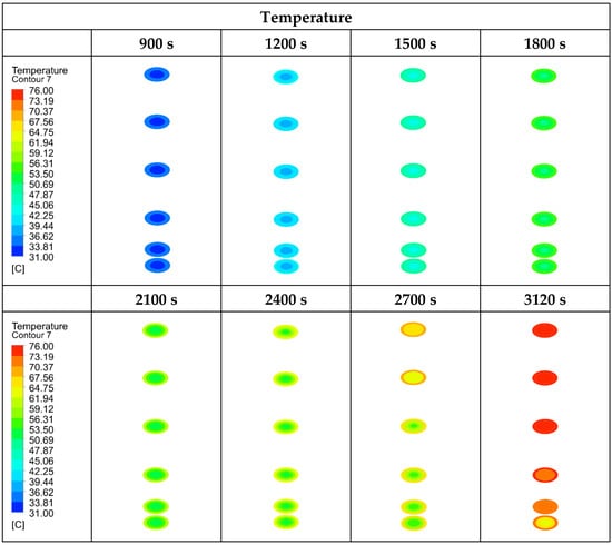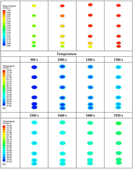 Figure 14 shows the liquid fraction and temperature contours of both the paraffin and the capsule (outer side of capsule, inner side of paraffin) during the melting process of encapsulated paraffin-2. Compared to EP1, it melted in a shorter time, as it had a lower melting point, and the liquid fraction in the first 900 s was 0 due to the wall thickness of the aluminum capsule. The heat flux was conducted from the outer surface of the capsule and reached the inner surface. When the temperature on the inner surface reached a sufficient level, the paraffin started to melt. Compared to Figure 12, unencapsulated paraffin-2 melted in 2640 s, while encapsulated paraffin-2 melted in 1920 s. This paraffin with a low thermal conductivity provided an increase of 27.27% in the efficiency of the LHS system during charging with the macroencapsulated PCM.
