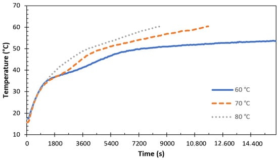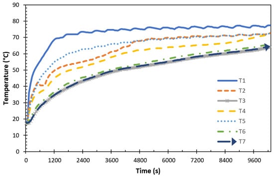 The seven thermocouples shown in Figure 15 were located in the plane 5 position mentioned in the numerical analysis results, where the melting process was completed last. Since the thermostat constantly fluctuated between the on and off state to reach the desired operating temperature, a stable HTF temperature could not be practically maintained while the system was running. For this reason, as can be seen in the figure, T1 was located closest to the HTF inlet and was affected by this temperature fluctuation throughout the melting process. During the initial heating phases, a consistent temperature increase was noted everywhere, signifying heat conduction. As the temperature rose, this was followed by a steep slope transition that indicated the PCM’s storage of latent heat. The axial and radial temperature profiles of all the thermocouples placed in the TESU during the melting process are shown in Figure 16.