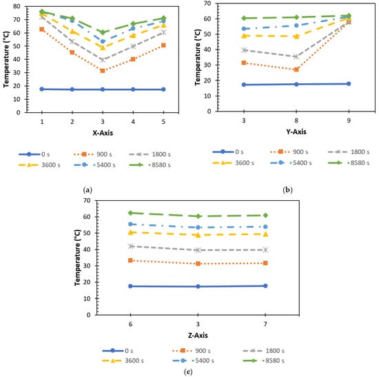Time-dependent axial and radial temperature variations for (a) the X-axis, (b) the Y-axis, and (c) the Z-axis during melting (P1, = 80 °C ve = 0.0333 lt/s).