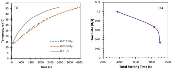 To determine how the intake HTF flow rate affected the charging efficiency, the flow rate was adjusted from 0.0333 to 0.1 l/s; the initial PCM temperature was fixed at 13–14 °C; and the HTF inlet temperature was fixed at 60 °C. For paraffin, the results obtained for P2 were used, since P1, which was selected as the reference PCM, could not melt completely at an HTF temperature of 60 °C. Figure 18a demonstrates that thermocouple T3’s temperature increased with an increasing water flow rate. However, significant temperature differences were only observed when a certain level was reached. On the other hand, increasing the HTF flow rate decreased the total melting time (Figure 18b). When the flow rate was increased from 0.0333 lt/s to 0.0666 lt/s, the total melting time decreased to 4.2%, and when the flow rate was increased from 0.0666 lt/s to 0.1 lt/s, it decreased to 27.9%. The observed decrease in the overall melting time at increasingly higher flow rates might be attributable to this thermal behavior, which could also be linked to increased heat transfer. In addition, all flow rates were in the laminar regime.