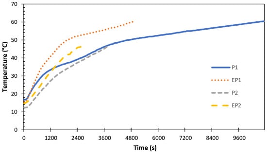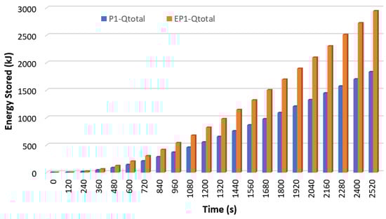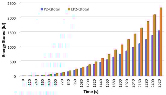 The total energy stored at the same time for P2 and EP2 ( = 70 °C and = 0.0666 lt/s).