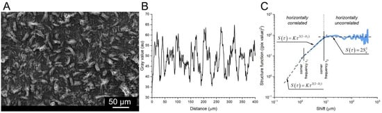 In the beginning, both steel samples were heat-treated in accordance with the specific processing guidelines. On one hand, the sample of X39Cr13 steel was hardened for 20 min at the austenitization temperature of 1050 °C followed by tempering for two hours at 300 °C. On the other hand, the sample of S355J2 steel was annealed for two hours at a temperature of 890 °C. Then, the surfaces were cleaned to remove residues and contaminants and degreased to allow the phosphate coating to be deposited. Prior to phosphating, prepared surfaces were activated in an aqueous solution (10%) of hydrochloric and sulfuric acids. Activation took 5 min at room temperature (22 °C). Finally, the phosphating was performed in a bath containing MnHPO4 (3 g/L), Mn(NO3)2 (10 g/L), ZnO (5 g/L), H3PO4 (20 g/L), NaF (1 g/L). The process parameters were as follows: T = 52 °C, t = 1 h. The tests were performed both on the processed surfaces and in the cross-sections of the samples. For this purpose, square pieces measuring 10 × 10 mm2 were cut out from the samples. The preparation of the metallographic specimens involved grinding and polishing. Selected samples were also etched in 5% nitric acid (for non-alloyed steel) and iron chloride (for alloyed steel). Detailed studies included observations in light microscope (LM Olympus GX41) and scanning electron microscope (SEM Jeol JSM-6610L) for metallographic examinations, chemical composition analysis and fractal analysis. The XRD experiments were carried out on a Seiffert 3003T/T diffractometer. A CoKα radiation cobalt lamp was used (λ = 1.79026 Å). The X-ray tube was operated at 40 kV and 30 mA. The XRD patterns were collected in 2 ranges between 5° and 90°. SEM images are composed of grayscale pixels corresponding to pseudo-heights that can be processed in order to derive various characteristics of the surface geometry. In the present paper, the two following approaches were used: (1) fractal analysis that makes use of scaling invariance between samples of averaged surface profiles [24,25,26,27,28,29,30] and (2) statistical approach working on the separated segments of original images. In the first method, original SEM images (example shown in Figure 1A) were averaged along the rows of the slow scan axis in order to obtain roughness profiles (Figure 1B), which were then processed into discrete structure functions according to the formula [31]: