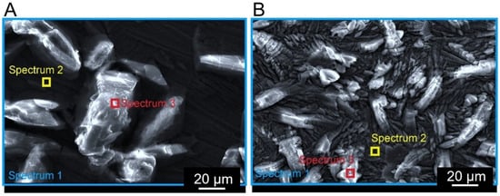 Steel surface after phosphating with a point and area spectrum markings: (A) X39Cr13 steel, SEM (SEI 30 kV, WD 10 mm, SS 46 (B) S355J2 steel, SEM (SEI 20 kV, WD 10 mm, SS 44).