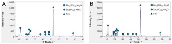 Significant differences in chemical composition of the deposited coatings were observed in X39Cr13 steel. EDS spectra taken from the needle (Figure 4A, Spectrum 3) appeared significantly different from those in the neighboring area (Figure 4A, Spectrum 2). The needles show significantly lower amounts of such elements as oxygen, phosphorus, manganese and zinc. On the other hand, an abundance of elements constituting the steel itself, such as iron and chromium, was observed in these parts of the samples. This shows that the coating made on alloyed steel is less tight than that on non-alloyed steel. The obtained XRD (Figure 5) results showed that the phosphate layer was composed of Zn3(PO4)2·4H2O and Mn3(PO4)2·3H2O. The zinc-based compound predominated to a large extent. Using a phosphorus bath with a similar chemical composition, Nguyen et al. [36] showed that in coatings with a ZnO content greater than 3 g/L contains mixed phases. There are, among others, compounds such as Mn3(PO4)2·3H2O and Zn3(PO4)2·4H2O. The XRD diagram presented by the researchers shows that there is only one reflection from which the Mn(PO4)2·3H2O phase originates. The remaining picks come from a zinc-based compound.