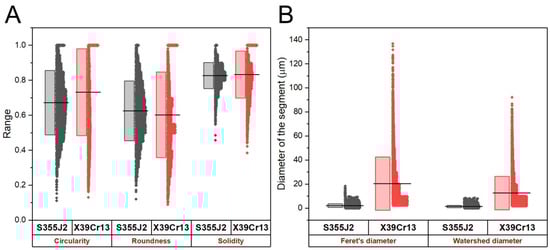 To verify the results of the fractal approach, additional analysis was carried out relying on the separation of SEM images into a series of touching segments followed by statistical analysis of their form and size to determine such shape descriptors as circularity, roundness and solidity, together with specific size parameters such as Feret’s diameter and watershed equivalent diameter. According to the literature [26], the Feret diameter of a particle can be defined as the distance between two parallel tangent boundaries of the object. In particular, the maximum and minimum Feret diameters, are often used for the characterization of particle sizes [27]. According to the literature [28], the minimum and maximum Feret diameters of objects are compared according to the aspect ratio, whereas the axial ratio refers to the best match between the minor and major axes of the ellipse. Detailed results are summarized in Table 5, where appropriate mean values are presented, and in Figure 6, where all data points are shown in a graphical form to reveal appropriate statistical distributions of the quantities under study together with their mean values and corresponding standard deviations. Note that SEM images with different magnification were chosen for this analysis (×300/S355J2 vs. ×75/X39Cr13) to ensure similar number of segments established in the scan area.
