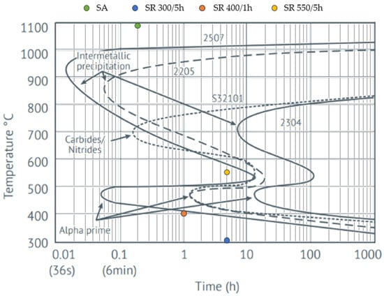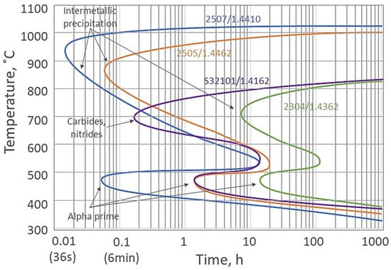 Duplex stainless steels are sensitive to intermetallic phases precipitations. Unwanted intermetallic phases, carbides, and nitrides can precipitate in these steels at various temperatures, particularly between 600 °C and 1000 °C. These include the sigma phase (σ), chi phase (χ), carbides (M23C6, M7C3), or nitrides (CrN, Cr2N), which can degrade their mechanical properties, particularly toughness, and reduce their corrosion resistance []. Furthermore, as the number of alloying elements (such as Cr, Mo, Ni) in DSSs increases, so too does the risk of secondary phase precipitation (as shown in Figure 1), which can affect both toughness and corrosion properties. This is particularly true for super DSS (SDSS) and high-alloy grades such as hyper duplex stainless steel (HDSS). To avoid secondary phase precipitation during heat treatment of DSS, the steel must be heated above 1000 °C and then rapidly cooled to dissolve any existing secondary phases and maintain a balanced microstructure [,]. It is essential to keep the steel outside the critical temperature range (as shown in Figure 1) to prevent the formation of detrimental phases such as sigma, chi, carbides, nitrides, alfa prime, etc. To prevent the formation of detrimental phases, it is important to use rapid cooling methods and minimize the time spent at intermediate temperatures. The rate of cooling is critical; if cooling is too rapid, ferrite may predominate, whereas if cooling is too slow, austenite may be favored. Ultimately, this can result in an unbalanced duplex microstructure [,].