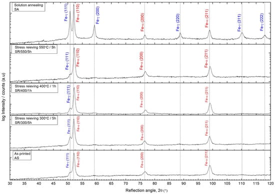 LPBF-printed super duplex stainless steel (SDSS) reveals almost entirely ferritic microstructure in the as-printed state. The ferrite is the primary phase because of a high cooling rate of 106–108 °C/s in the LPBF process. The X-ray diffraction pattern (Figure 3) of as-printed SDSS, reveals strong ferrite phase peaks at Fe-α (110), (200), and (211), and one weak austenite phase peak at 2θ angle related to Fe-γ (111). The stress-relieving heat treatments at the studied temperatures do not affect the phase composition, but they do cause a minor increase in the intensity of the major austenite peak at Fe- γ (111). For the solution-annealed conditions, a fully balanced microstructure was formed, and both phases coexisted in a close-to-balanced share. In this case, peaks deriving from austenite, such as Fe-γ (111), (200), (220), (311), and (222), were clear. The austenite content is 5% in as-printed and stress-relieving conditions, and 52% for the solution annealing.