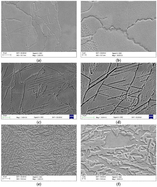 SEM microstructure of LPBF-printed SDSS (a,b) in as-printed conditions, (c,d) after stress relieving at 550 °C for 5 h, and (e,f) in solution-annealed conditions.