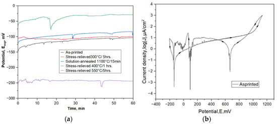 The results of the potentiodynamic polarization testing are presented in Figure 5 and summarized in Table 3. The effect of heat treatment on open circuit potential (Eocp) values in stress-relieving and solution-annealed conditions was clearly noticeable (Figure 5a). For all SDSS conditions, a shift to positive Eocp values after 60 min of immersion was observed (Figure 5a). The Eocp of the SDSS tested ranged from −244 mV to −28.6 mV, with the stress-relieved sample at 400 °C/1 h having the higher value (−28.6 mV). The Eocp of as-printed and stress-relieved samples at 300 °C/5 h show similar values, in the range −88 to −103 mV. The lowest shift toward negative values of Eocp = −244 mV was observed for samples stress relieved at 550 °C/5 h. The lower open-circuit potential suggests faster material dissolution reactions and, as a result, a lower corrosion resistance.