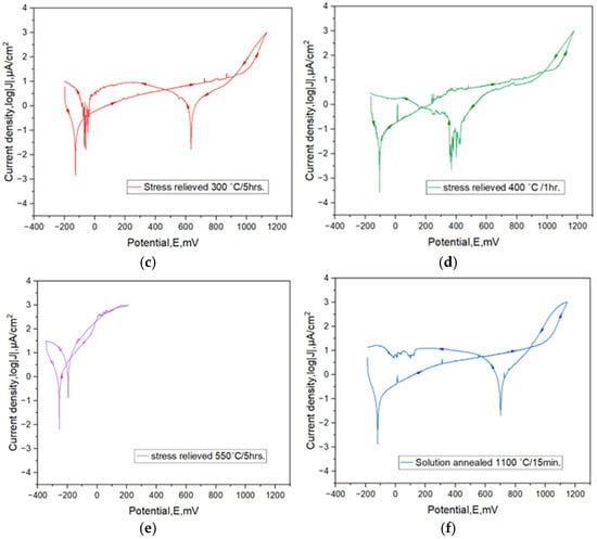 The potentiodynamic polarization-corrosion testing results of LPBF-printed SDSS: (a) open circuit potential; potentiodynamic polarization curves: (b) as-printed; (c) stress-relieved at 300 °C/5 h; (d) stress-relieved at 400 °C/1 h; (e) stress-relieved at 550 °C/5 h; (f) solution-annealed at 1100 °C/15 min. Arrows indicate the direction of the potential scan, the forward and backward scan.