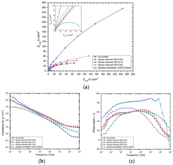 The impedance modulus (|Z|) as a function of log. frequency (Figure 6b) follows a similar course for the as-printed conditions after heat treating at 300 °C/5 h and after solution annealing. However, when heat treated at 400 °C/1 h and 550 °C/5 h, the modulus value gradually decreases at high frequencies, particularly for the 500 °C/5 h condition. A high modulus value over a wide frequency range indicates higher corrosion resistance.