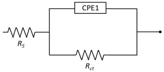 The characterization of the interface impedance of the tested samples was carried out by approximating the experimental EIS data with an electrical model of the equivalent circuit, as shown in Figure 7. A single constant equivalent circuit was used for all samples, which can be interpreted as a single oxide layer on the surface. The electrical equivalent circuit (EEC) adopted was composed of two resistors and a constant-phase element (CPE). The Rs value corresponds to solution resistance and Rct is the charge transfer resistance in the phase interface that may be directly linked to the corrosion resistance of the surface. Because of the dispersion of time constant and dispersion due to surface adsorption/diffusion processes, known as the kinetic dispersion effect [], constant phase element (CPE1) was selected to describe capacitance in the EEC. The CPE1 is described by capacitance parameter Ydl and n that is CPE exponent and its impedance is defined as ZCPE = 1/Ydl (jω)n. The double layer capacitance Cdl of the system was then computed with the “Pseudocapacitance” tool in EC-Lab software []. Table 4 summarizes the calculated EIS parameters.