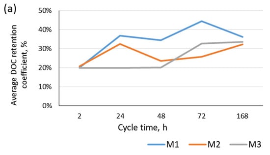 In contrast, in the case of the treatment of backwash water from the infiltration water treatment plant, the membrane in the M1 module was characterized by a stable level of organic matter retention throughout the filtration cycle (Figure 4). The lower organic retention efficiency for this membrane can be explained by the presence of large amounts of iron and manganese compounds, with their presence intensifying membrane fouling. For the other two membranes, the degree of organic matter removal was similar to that found for backwash water from surface water treatment because of the cyclic mechanical removal of contaminants from the membrane surface using backwashing (Figure 5b).
