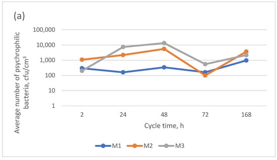 The backwash water from surface water treatment was characterized by a very high psychrophilic bacteria count (Table 2), between 1.5 and 12 times higher than that found in the backwash water from infiltration water treatment. The presence of such a large number of microorganisms significantly affected their counts in the permeate after microfiltration (Figure 7).