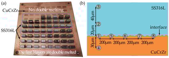 The interface hardness between SS316L and CuCrZr was measured in the transition range using a 350 W laser power. (a) Without remelting; (b) the first 3 layers are remelted.