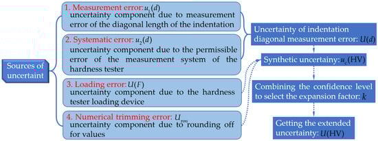 In the microhardness measurement, the test force is represented by , and the arithmetic mean of the diagonal of the two indentations is represented by The error in microhardness measurement mainly arises from four aspects [,]: (1) the measurement error of the arithmetic mean d of the diagonal of the indentation ; (2) the permissible error of the hardness tester measurement system ; (3) the error of the hardness tester loading device during the loading process ; (4) the error introduced by numerical modification . Equations (4)–(7) are used to calculate the error components of the four aspects mentioned above. The uncertainty of the indentation diagonal measurement and the relationship between and are calculated by Equation (8).