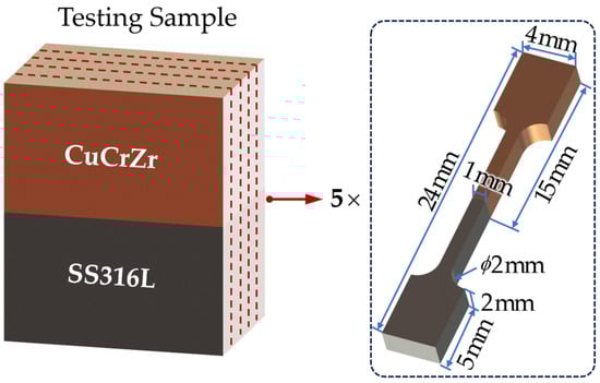 Additive Manufacturing (AM) technology, as a novel manufacturing method, is distinguished by its rapid molding speed, high manufacturing precision, and excellent mechanical properties [,,]. Currently, it is employed in a number of fields, including aerospace [,], automotive [,], biomedical [,], and others. In the field of nuclear engineering, numerous industry norms and standards prohibit the utilization of AM components. Consequently, a number of pressurized structure AM components, including miniature heat exchangers [,], storage tanks [,], and pump units [], remain in the experimental phase. Nevertheless, in non-pressurized structures, AM technology has made significant advancements, with a particular focus on the production of fuel, cladding, and control components within the reactor core [,,]. Westinghouse was one of the first organizations to propose the installation of AM assemblies in reactors. The thimble clogging device produced by the company is currently undergoing field trials. Furthermore, AM components [High Flux Isotope Reactor (HFIR) and AM Capsule] at Oak Ridge and Idaho National Laboratory have entered the trial stage [,], and AM components are also used in spent fuel recycling and reuse []. The majority of the aforementioned outcomes are based on the advantages of AM technology in forming complex structures. However, there has been no reported application of multi-metallic AM technology in the nuclear industry. In comparison to the HIP diffusion joining technology, the production of SS316L/CuCrZr joints by AM technology offers a significant advantage, particularly at the interface. This can be achieved without the need for complex surface treatment on both sides of the joints and subsequent HIP diffusion joining, which greatly simplifies the manufacturing process. Furthermore, the use of a computer-aided design (CAD) model allows for parallel manufacturing, which in turn facilitates the simultaneous production of multiple AM components, thereby enhancing overall production efficiency. The most common multi-metal additive manufacturing technologies include Directed Energy Deposition (DED), Powder Bed Fusion (PBF), and Binder Jet (BJ). Among these technologies, PBF is distinguished by its ability to produce components with the highest densities and precision, without the need for binder assistance. Furthermore, it ensures high bonding quality at the CuCrZr/SS316L interface and can be applied in the neutron-active region [].