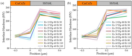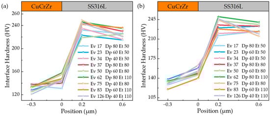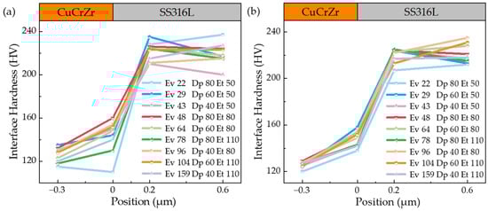 Extensive experimental work is required to determine the processing window for the new material combination due to the different laser absorption coefficients and thermal properties inherent in SS316L and CuCrZr. These process parameters are critical for predicting the performance of the experimental samples. Figure 5, Figure 6 and Figure 7 show the hardness profiles of the samples under different parameters, and Figure 8a illustrates the effect of volumetric energy density on interfacial hardness.