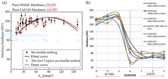 (a) The trend of hardness with Ev observed in SS316L/CuCrZr samples. (b) Interfacial microhardness of diffusion-bonded metal joints [].