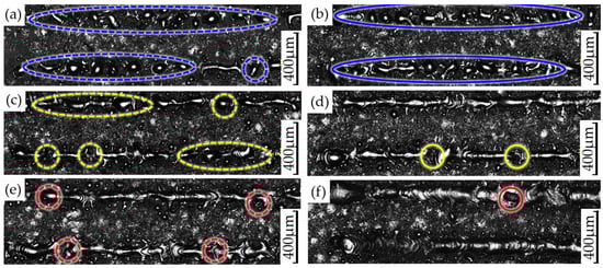 To provide a clearer explanation of the impact of Ev on the interfacial hardness of dissimilar metals, we further compiled and plotted the data from Figure 5, Figure 6 and Figure 7 in Figure 8a. Overall, the interfacial hardness of dissimilar metals gradually increases and then decreases. However, it is important to note that interfacial hardness is not the sole criterion for measuring the quality of parts. Further analysis is needed to address crack defects and internal holes. It is evident that the print trajectory is not continuous when Ev is less than 17 J/mm3 [Figure 9a,b]. The reasons for this are described in detail in the second paragraph of this chapter. Discontinuous trajectories result in holes in the final molded block (shown by blue circles) due to the stacking of these trajectories. This stacking effect is exacerbated by surface tension, resulting in holes with a maximum size of 64.3 μm [Figure 10a]. Microcracks near the interface are present (shown by blue arrows). As per the preceding section, a decrease in Ev results in a minimal CuCrZr melt, and a fragile copper film with reduced strength forms near the interface during cooling. The difference in thermophysical properties between SS316L and CuCrZr causes their cooling rates to differ, ultimately resulting in high residual stresses in the SS316L phase. This, in turn, leads to the generation of thermal penetration cracks (length 35.7 μm, width 3.2 μm) [Figure 10b]. Therefore, utilizing a lower laser bulk density to manufacture SS316L/CuCrZr samples will lead to relatively low mechanical properties near the interface and overall fatigue life. This situation can be alleviated by adjusting the scanning strategy and reducing the print speed, but it will significantly increase the print time. When the energy density is between 17 J/mm3 and 65 J/mm3, the melt pool continuity improves significantly. However, small gaps may still form (indicated by the yellow dotted circle) [Figure 9c,d], with a maximum size of 48 μm. These gaps can be reduced by adjusting the scanning spacing and ensuring good overlap, taking into account surface tension and molecular forces. The size of the hole is also small (maximum size 35.3 μm) [Figure 10c]. There is no visible crack. This is because an increase in Ev leads to an increase in the melt pool volume and cooling time, as well as an increase in the degree of the alloying of dissimilar metals. Although residual stresses are present, they are relatively evenly distributed and not sufficient to cause visible cracks. When the laser volumetric energy density exceeds 65 J/mm3, the metal powder’s molten pool may be blown away by the large vaporization recoil during the printing process [], resulting in regularly shaped pores (maximum size 84 μm) [Figure 9e]. However, we observed that no significant pores were formed in the final block. This is because, at higher Ev values, the molten pool can easily remelt the already solidified pool of the previous layer and fill up the pores that existed in the previous layer. Nevertheless, the interfacial hardness in the range is relatively low due to the high degree of alloying.