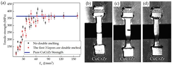 (a) Trend of tensile strength with EV for different SS316L/CuCrZr samples; (b) Ev = 13 J/mm3 and (c) Ev = 54 J/mm3; (d) fracture position at Ev = 90 J/mm3.
