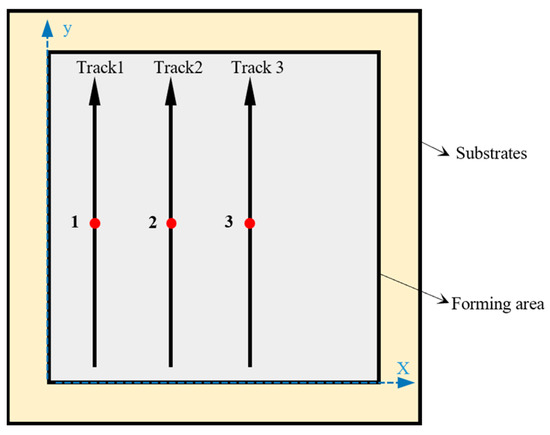 Schematic diagram of SLM scanning strategy. Where 1, 2, and 3 in the figure are the midpoints of three different scanning trajectories, respectively.