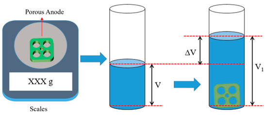 where is the energy density, J/mm3; is the laser power, W; is the scanning speed, mm/s; is the powder thickness, mm; indicates the scanning interval, mm. In addition, the densification of porous aluminum anodes was tested using the drainage method, the principle of which is shown in Figure 3. The formula for calculating the densities by the drainage method is as follows: