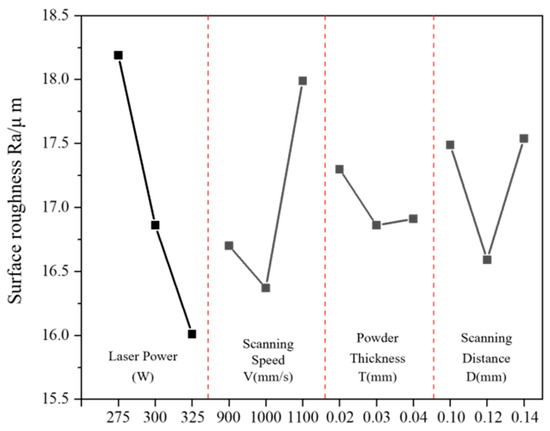 Figure 4 shows the influence curve of different factors on the surface roughness in the porous aluminum anode. The relationship between the four process parameters and the surface roughness in the porous aluminum anode can be further analyzed based on this figure. When the range of laser power is 275 W~325 W, the surface roughness decreases gradually with the increase in laser power. At the same time, the surface roughness basically decreases almost linearly with the increase in laser power. The surface roughness decreases from 18.19 μm to 16.86 μm and 16.01 μm, with 7.31% and 11.98%, respectively. The effects of scanning speed on the electrode surface roughness all show a trend of decreasing and then increasing. Meanwhile, the variation of surface roughness in the interval of 1000 m/s~1100 m/s is significantly higher than that in the front part. The trends of the effects of powder laying thickness and scanning spacing on surface roughness are similar to those of scanning speed, while showing a smaller variation amplitude.