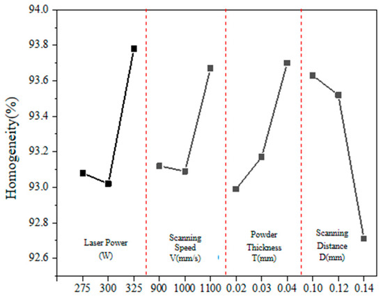 Figure 5 shows the influence curve of different factors on the porous aluminum anode density. According to this figure, the relationship between the four process parameters and the porous aluminum anode densities can be further analyzed. The density of the porous anode increases with increasing laser power. This indicates that, with the increase in laser power, the densities of the specimens show a trend of slightly decreasing and then increasing. The effects of scanning speed and powder thickness on the densities of the specimens are similar to those of the laser power. That is, with the increase in scanning speed, the density of the specimen firstly decreases and then increases. The scanning spacing is different from the former, showing a linear decreasing trend. This indicates that the effect of scanning distance on the densities is opposite to that of the thickness of the laid powder. At the same time, it is not difficult to see that, when the thickness of the laid powder is in the range of 0.10 mm~0.12 mm, the value of the densification is relatively stable. When the sweep spacing is 0.14 mm, the densification of the porous aluminum anode decreases sharply to only 92.71%. This indicates that the variation of the sweep thickness has a more direct effect on the molding effect of the densities.