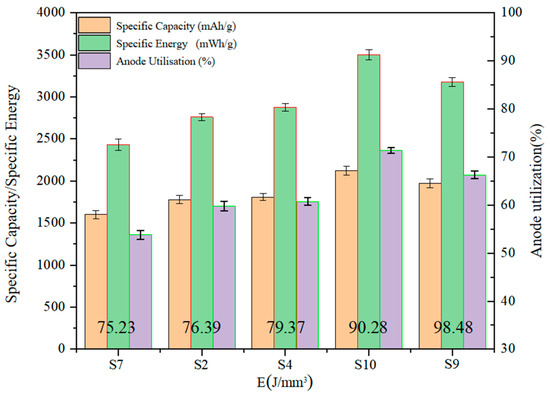 Figure 11 shows the variation of anode utilization for aluminum–air batteries at different laser energy densities. It can be seen that the anode utilization rate shows an increasing and then decreasing trend with the increase in laser energy density. When the laser energy density is 75.23 J/mm3, the anode utilization is 53.79%. When the laser energy density increases to 76.39 J/mm3 and 79.37 J/mm3, the anode utilization rate increases by 11.23% and 12.96% at this time, respectively. When the laser energy density increases to 90.28 J/mm3, the anode utilization at this point is maximum at 71.32%. Compared with the S7 aluminum anode at a laser energy density of 75.23 J/mm3, the anode utilization increases by 32.59%. However, when the laser energy density is 98.48 J/mm3, the anode utilization decreases by 7.08%. The magnitude of the values of the specific capacity and specific energy of the aluminum–air battery is affected by the calculation formula, and the trend of change presents a consistent feature with the anode utilization rate.