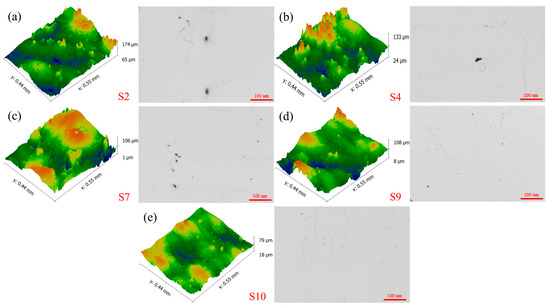 (a) High-energy-density interval sample S1 3D morphology and metallograph; (b) Low-energy-density interval sample S3 3D morphology and metallograph; (c) Low-energy-density interval sample S5 3D morphology and metallograph; (d) High-energy-density interval sample S6 3D morphology and metallograph; (e) High-energy-density interval sample S8 3D morphology and metallograph.