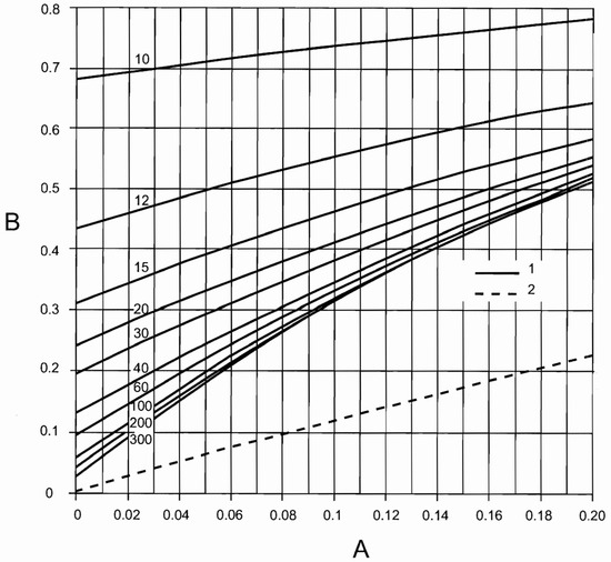 British Standard [16]. Reduction factor (, (B)) as function of structural damping (A). Solid lines (line no. 1) represent pedestrian groups, while the dashed line (line no. 2) indicates areas dedicated for crowd loading. Each solid line (line no. 1) is related to the effective span length [m] of the bridge.