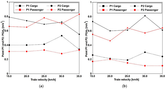 PGAs of the acquired acceleration histories, used for numerical simulation purposes regarding train-induced vibration, vary depending on the type of train (passenger and cargo) and its velocity. Horizontal (a) and vertical (b) direction.