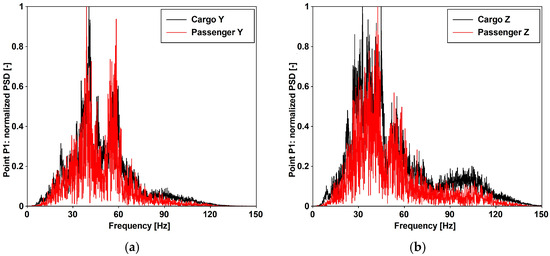 A comparison of the frequency domain characteristics for cargo and passenger trains with a velocity of 30 [km/h] for: (a) horizontal and (b) vertical direction.