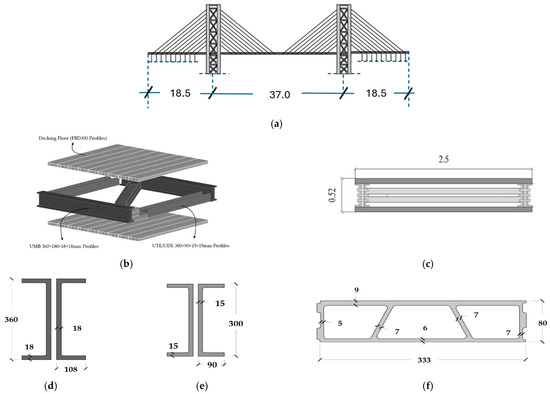 Salerno footbridge (Italy, 2020): (a) side view (dimensions provided in meters [m]); (b) 3D visualization of the deck system; (c) cross-sectional representation of the deck system (dimensions provided in meters [m]); (d) FRP profiles implemented for main girders (dimensions provided in millimeters [mm]); (e) FRP profiles implemented for cross-bars (dimensions provided in millimeters [mm]); (f) FRP profiles implemented for deck (dimensions provided in millimeters [mm]).
