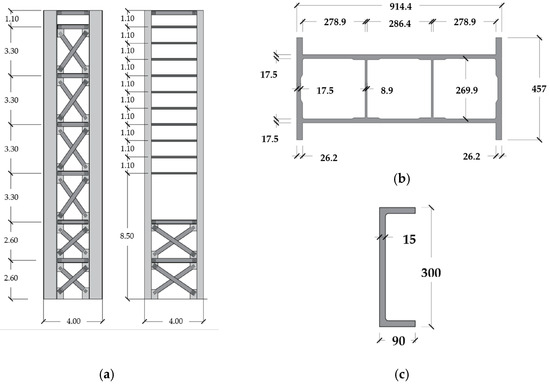 Pylons designed for Salerno bridge: (a) general view (dimensions provided in meters [m]); (b) FRP profiles implemented for the main construction of pylons (dimensions provided in millimeters [mm]); (c) FRP profiles implemented for the stiffening girders of pylons (dimensions provided in millimeters [mm]).