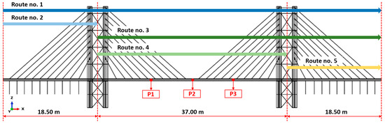 The methodology employed for evaluating comfort is derived from the approach utilized in studying the Aberfeldy footbridge, as detailed in [28]. This assessment encompasses vibrations induced by both pedestrians and trains. Pedestrians are expected to follow one of the five designated routes (Figure 10), with seven combinations considered, as outlined in Table 11. Pedestrians in the group are assumed to walk or run under continuous flow conditions. The simulation of train travel involved applying the recorded acceleration time history at the base of the pylons.