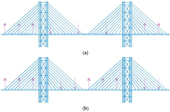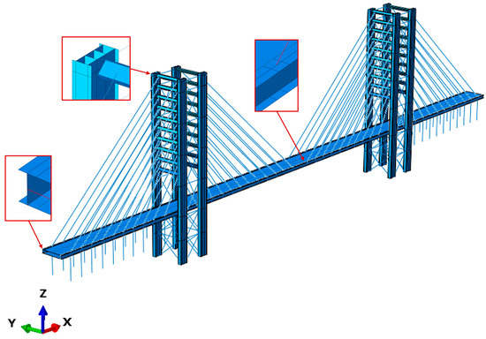 The finite element method (FEM) model of the footbridge (Figure 11), implemented using ABAQUS/Standard [42], comprises 151,051 linear S4R and T3D2 elements. Truss elements were used for the discretization of cables, utilizing an equivalent Young’s modulus. Additionally, shell orthotropic elements, applying lamina theory, were used to simulate the pylon and deck elements.