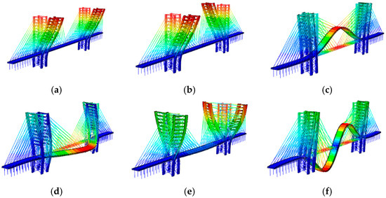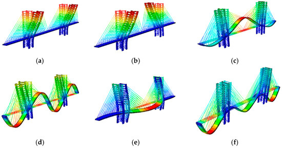 The mode shapes and frequencies obtained for Variant A of the Salerno footbridge: (a) , (b) , (c) , (d) , (e) , (f) .