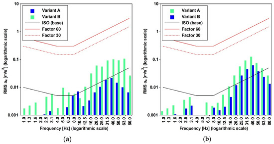 Variant A vs. B. Comfort criteria assessment for foot-to-head direction based on ISO [15] standard. Passage of: (a) cargo train (speed 30 [km/h]); (b) passenger train (speed 35 [km/h]). RMS values at the middle span of the structure (B control point).