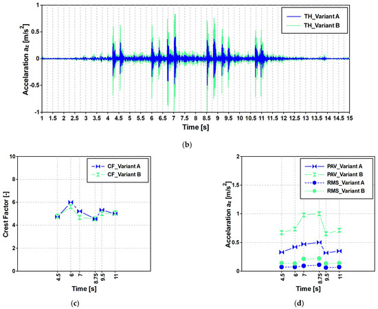 Analysis of the acquired signal. Variant A vs. B. (a) Example of acceleration time history; (b) crest factors; (c) PAV and (d) RMS values.