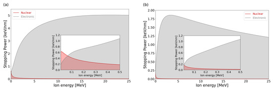 SRIM calculation showing the nuclear and electronic energy loss as a function of ion energy ((a) Si ion in SiC, (b) C ion in SiC). The region where nuclear stopping power is significant is zoomed in and shown in the inset.