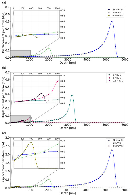 SRIM predicted damage dose (dpa) for the SiC samples irradiated with different energies of Si (a,c) and C (b) ions (in Table 1—samples 1–16). Inset plots represent a region investigated by RBS/C analysis (highlighted in gray).