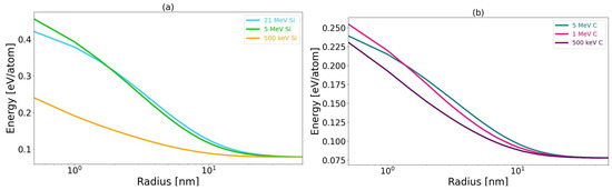 The radial distribution of energy after Si (a) and C (b) ion irradiation. Initial temperature of the SiC sample: 25 °C.